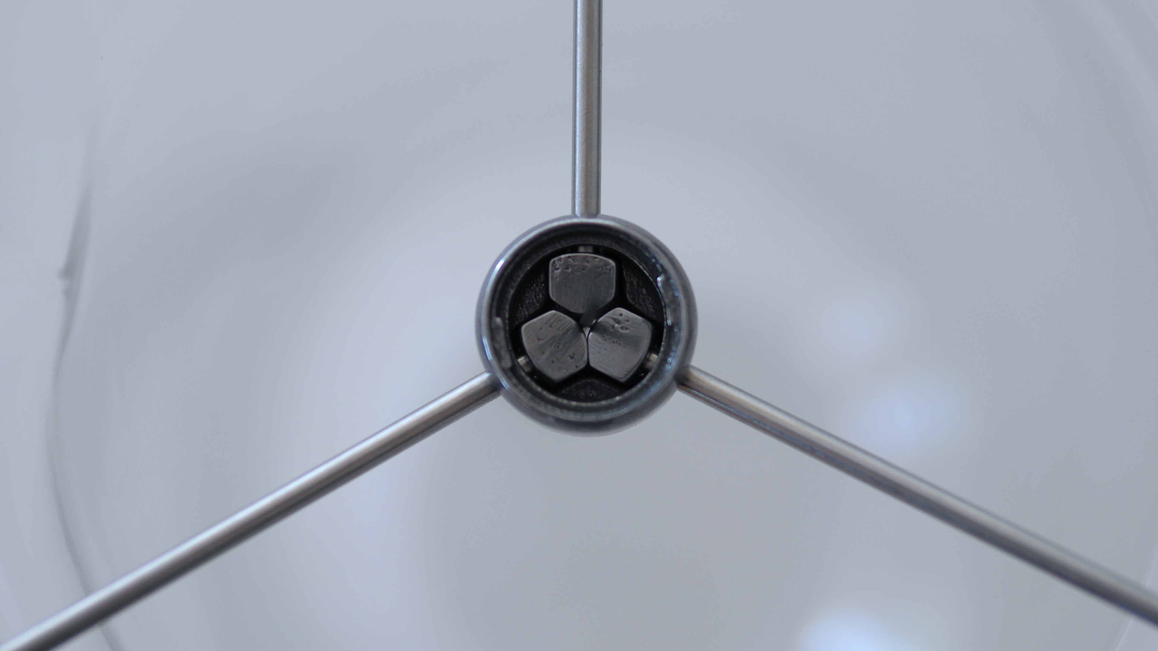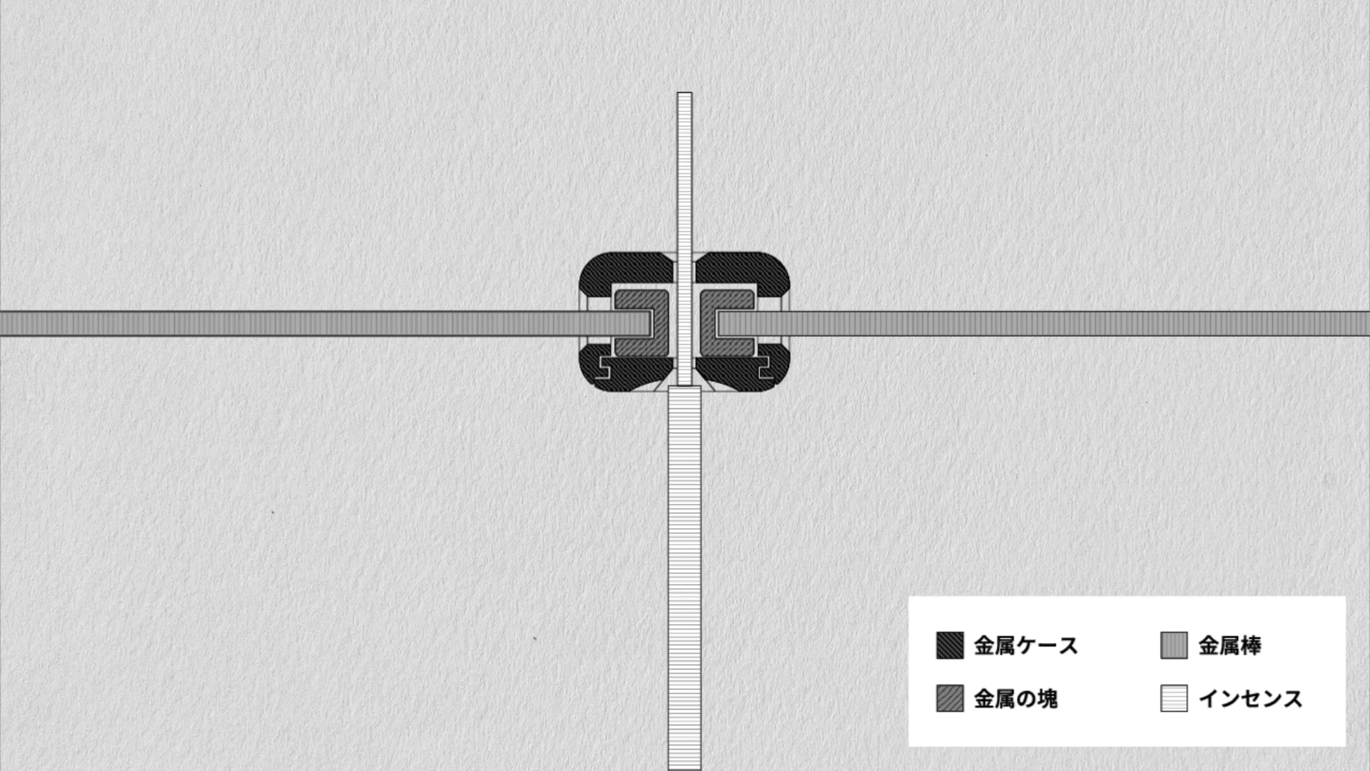 世の中に流通している既製品を活用し、特に耐熱性と防汚性の観点からビーカーを採用しました。軸ありタイプのインセンスの固定方法は吊り下げ式とし、自重によって固定される構造を設計しました。これにより設置面積を小さくすることができました。