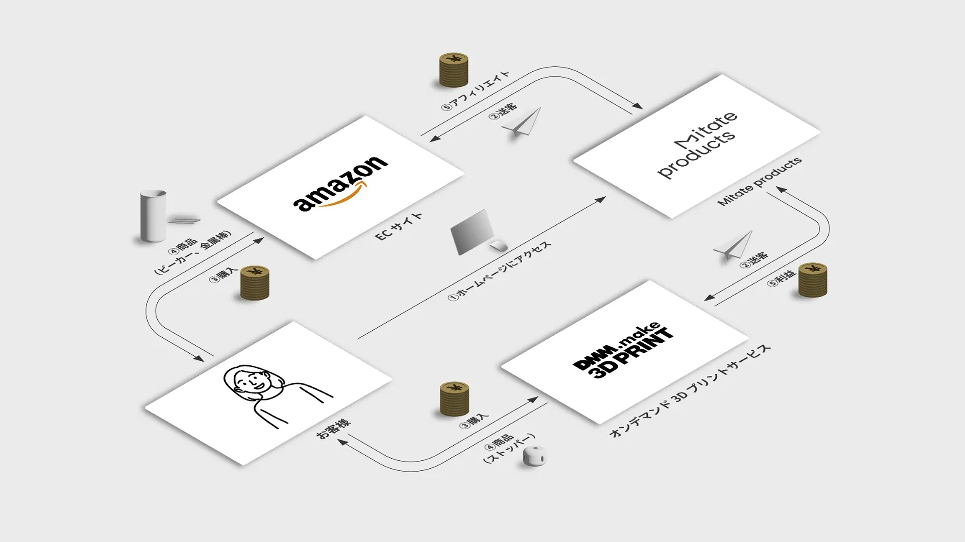 Mitate productsというブランドとしては、商品そのものを売るのではなく、商品を構成する部材・購入先のリンク・組み立て/操作方法を紹介するのみです。これにより製造や在庫管理などをすることなく、送客手数料、オリジナル部材の利益、アプリ課金から収益を得る仕組みを設計しました。